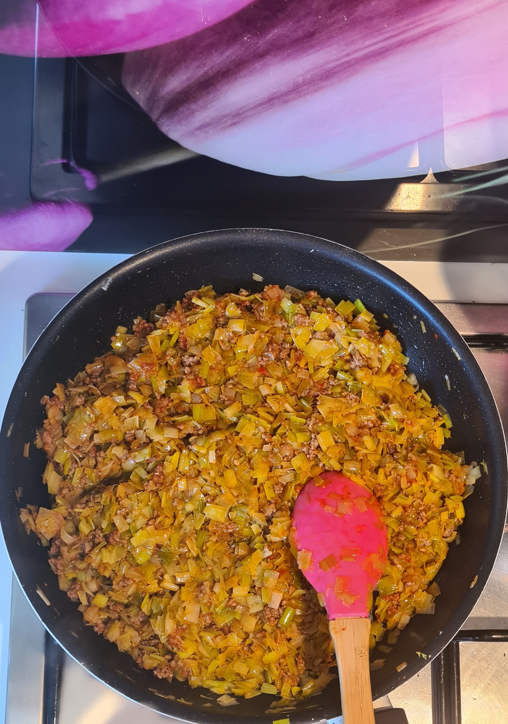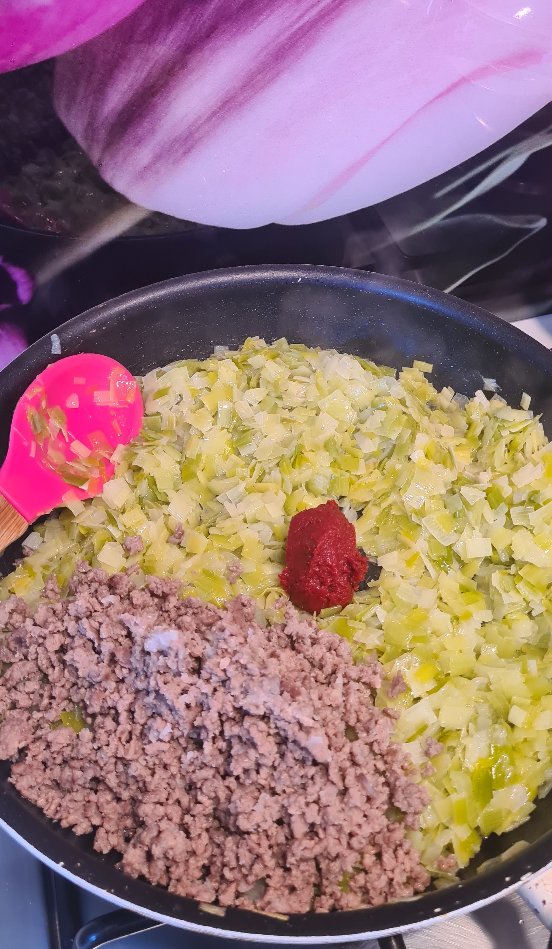 - Soğanı yemeklik doğrayın. Pırasaları da soğan gibi ufak ufak doğrayın. Ardından sıvıyağda önce soğanı sonra pırasaları kavurun. Başka bir tavada 2 yemek kaşığı sıvıyağla kıymayı pişirin. Pişen kıymaları pırasalara ekleyin. Salçayı ,tuzu,karabiber ve kırmızı biberi ekleyin. 5 dakika pişirin. İç harcı bir kenarda soğutun.