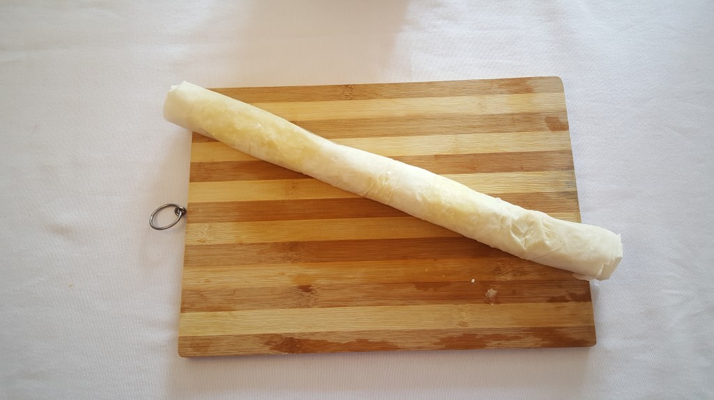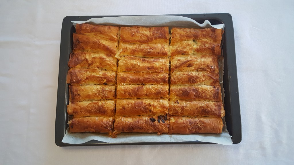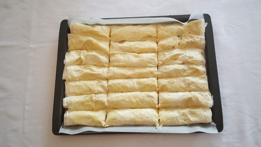 - Sos malzemelerini derin bir kapta karıştırın. Baklava yufkasının bir katını serin ve sostan 1.5 kaşık alarak fırçayla yayın. Bu şekilde 4 kat yapın ancak son kat yufkaya sos sürmeyin. Yufkanın geniş kenarına iç harcı koyun ve sıkı olmayacak şekilde sarın. Bütün yufkaları aynı şekilde hazırlayın. Yağlı kağıt serilmiş tepsiye dizin. Kalan sosu üzerine sürün. İstediğiniz boyutta kesin. Önceden 180°C de fanlı fırında pişirin. Yaklaşık olarak 30-35 dakikada pişiyor. Bir gün önceden hazırlayıp dinlendirdikten sonra pişirirseniz daha güzel oluyor.
