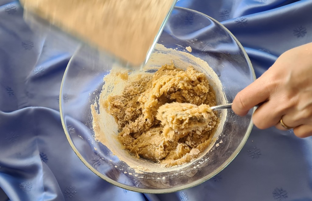 - Tahin, toz şeker, tereyağı ve yumurta sarısını derin bir kapta karıştırın. Unu kontrollü şekilde ekleyin. Vanilyayı koyun. Hamur çok yumuşak olmayacak. Ceviz büyüklüğünde hamuru şekillendirin. Yumurta beyazına ardından çekilmiş cevize batırıp tepsiye dizin. Fırını önceden 170 °C de ısıtın ve yaklaşık 20-25 dakika pişirin.