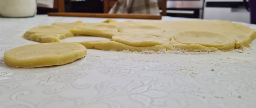 - Önce sıvıları karıştırın. Ardından unu, tuzu ve kabartma tozunu ekleyin. Hamuru merdaneyle 1 cm. kalınlığında açın. Kalıpla şekillendirin.