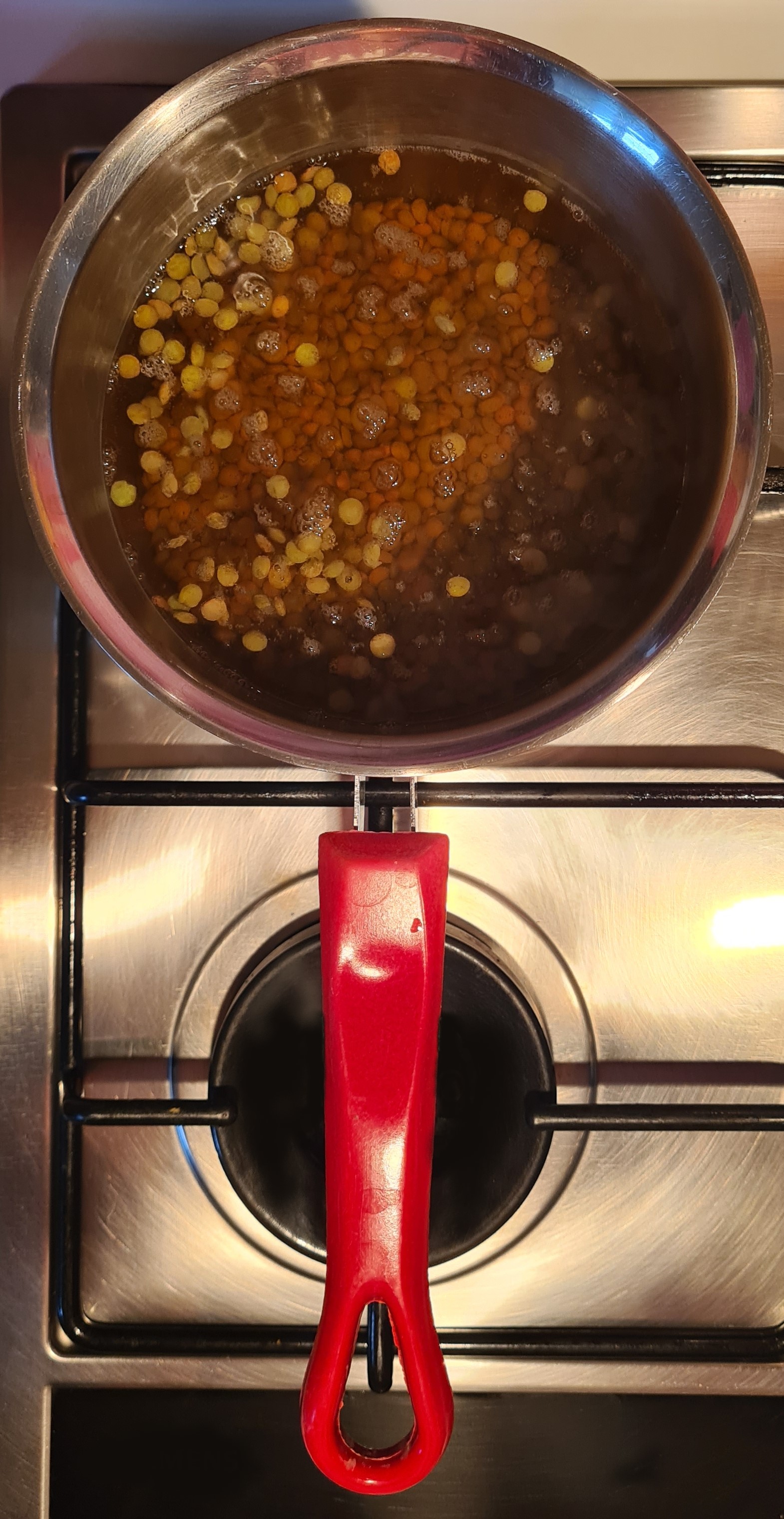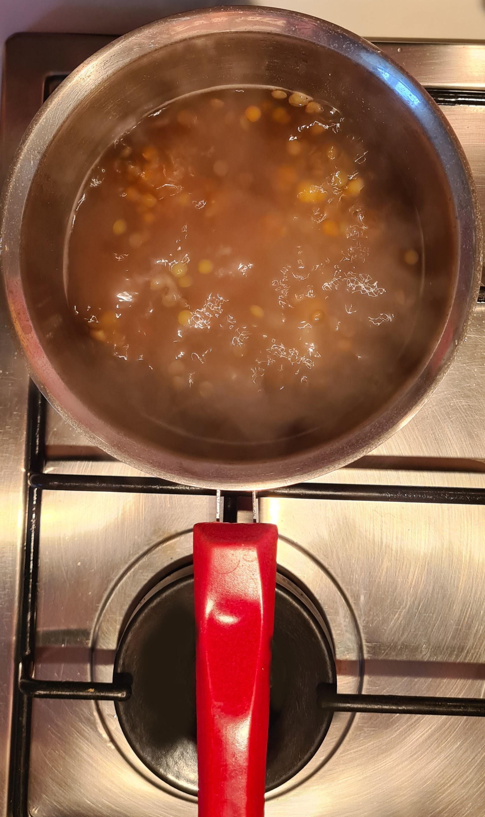 • Yeşil mercimeği bir gece önceden ıslatın. Bu işlem suyunun kararmamasını sağlayacak. Çorbayı yapacağınız tencerede yeşil mercimeği haşlayın. Nohutları ekleyin.Kaynatın.