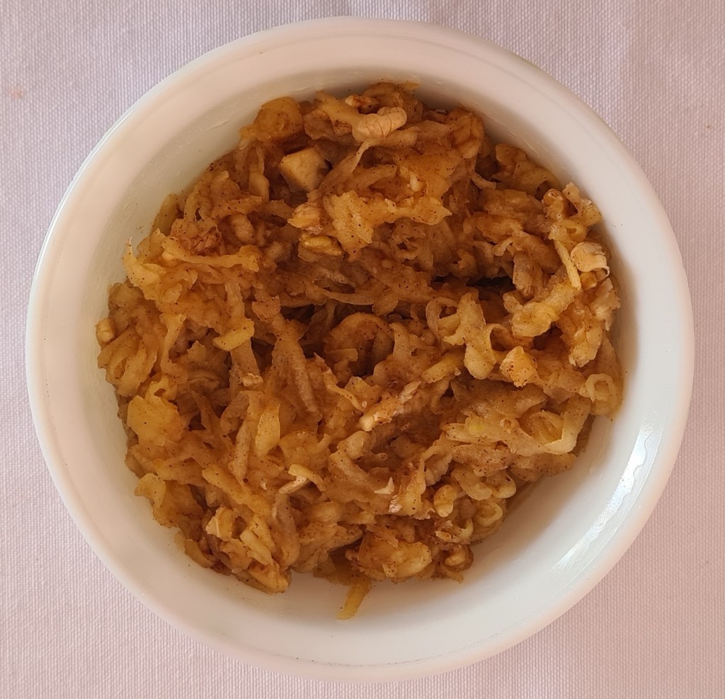 - Elmaların kabuklarını soyup rendeleyin. Ardından bir tavada elmaları 2 yemek kaşığı toz şekerle pişirin. Ocaktan alıp tarçını ve doğranmış cevizi ekleyin.