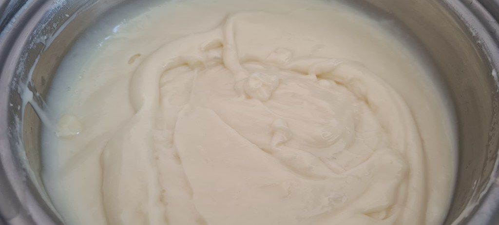 - Krem şantiyi 1 su bardağı süt ile çırpın. Ilınmış muhallebinin içine ekleyerek karışana kadar çırpın.
