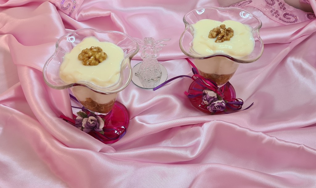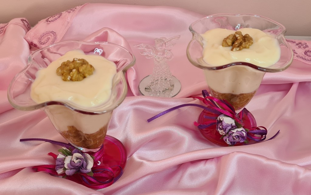- Servis yapacağınız kup veya kaselerin dibine elmalı harcı paylaştırın. Üzerine muhallebiyi koyun. Soğumaya bırakın. Buzdolabında dinlendirin. İstediğiniz gibi süsleyerek servis edin.