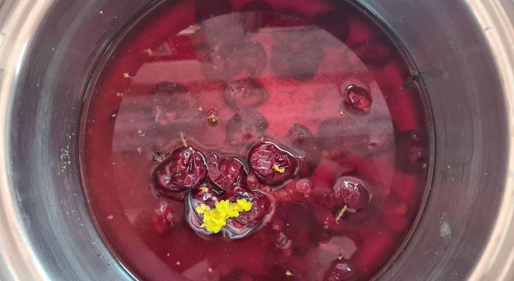 - Esmer şeker, karanfil, limon kabuğu rendesi vişneleri bir tencereye koyup 1.5 su bardağı suyu ekleyin ve kaynatın.