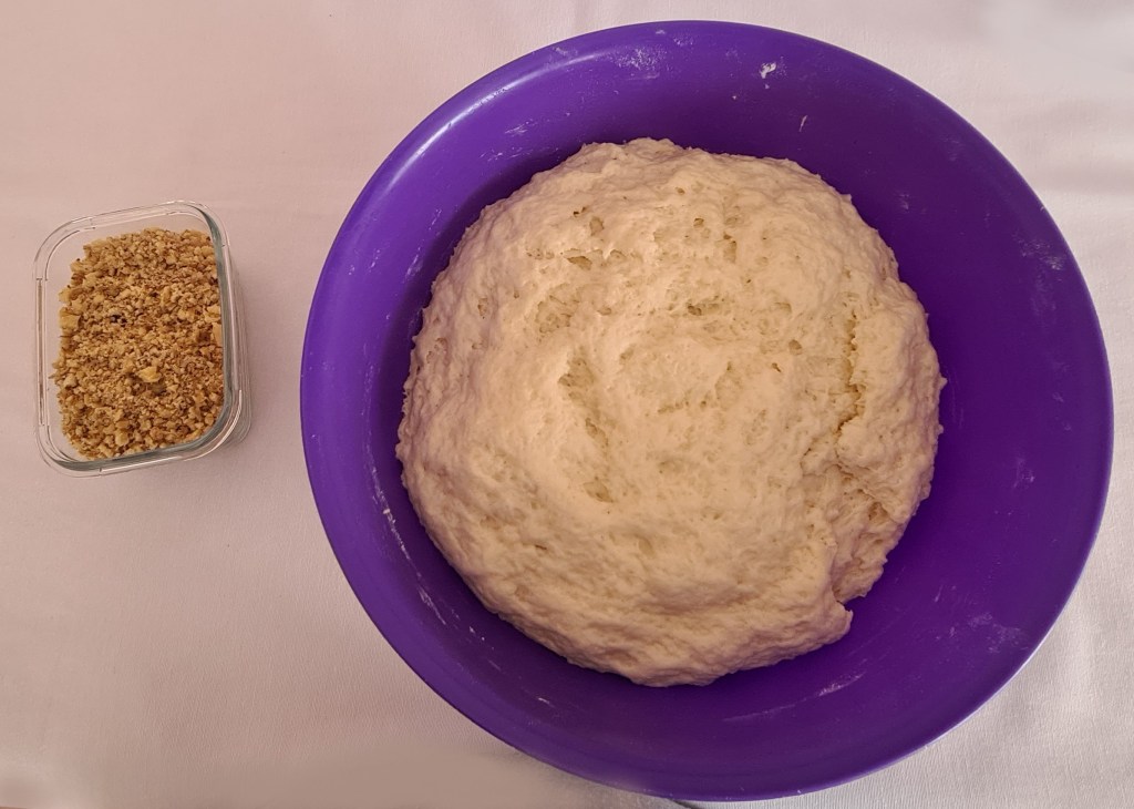 - Unu bir kaba alın ve mayalı karışımı, tuzu ekleyip yoğurun. Hamurun kıvamı yumuşak olmalı ekmek hamuru gibi. Üzerini örterek oda sıcaklığında 1 saat mayalandırın.