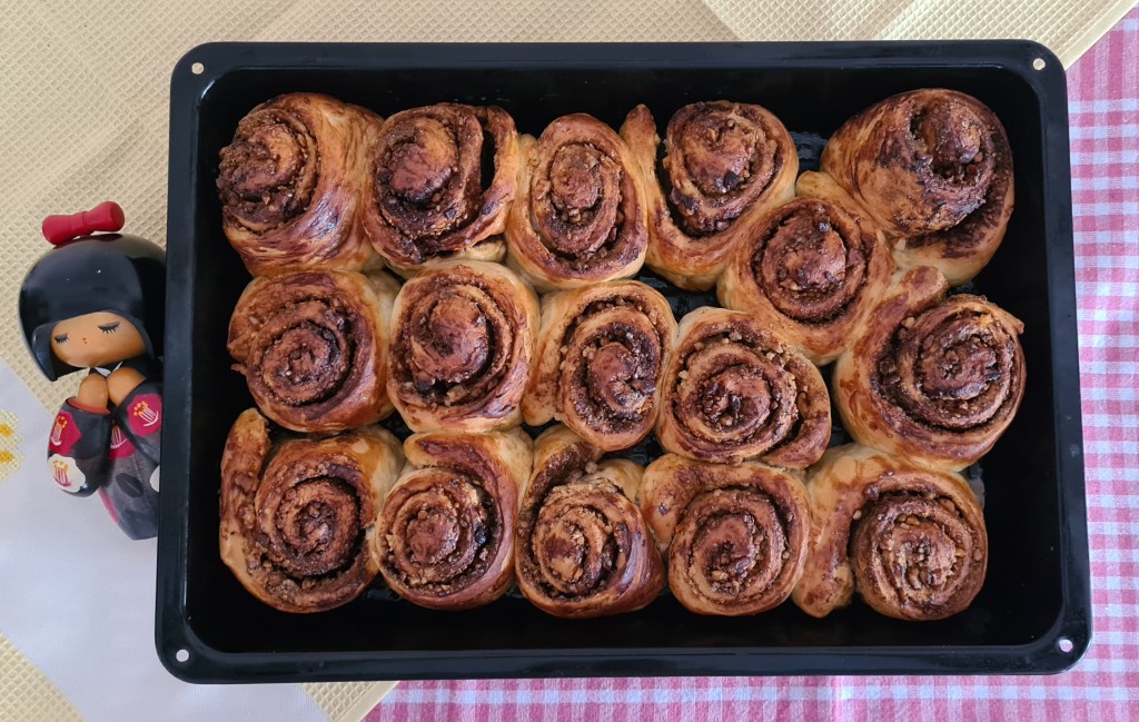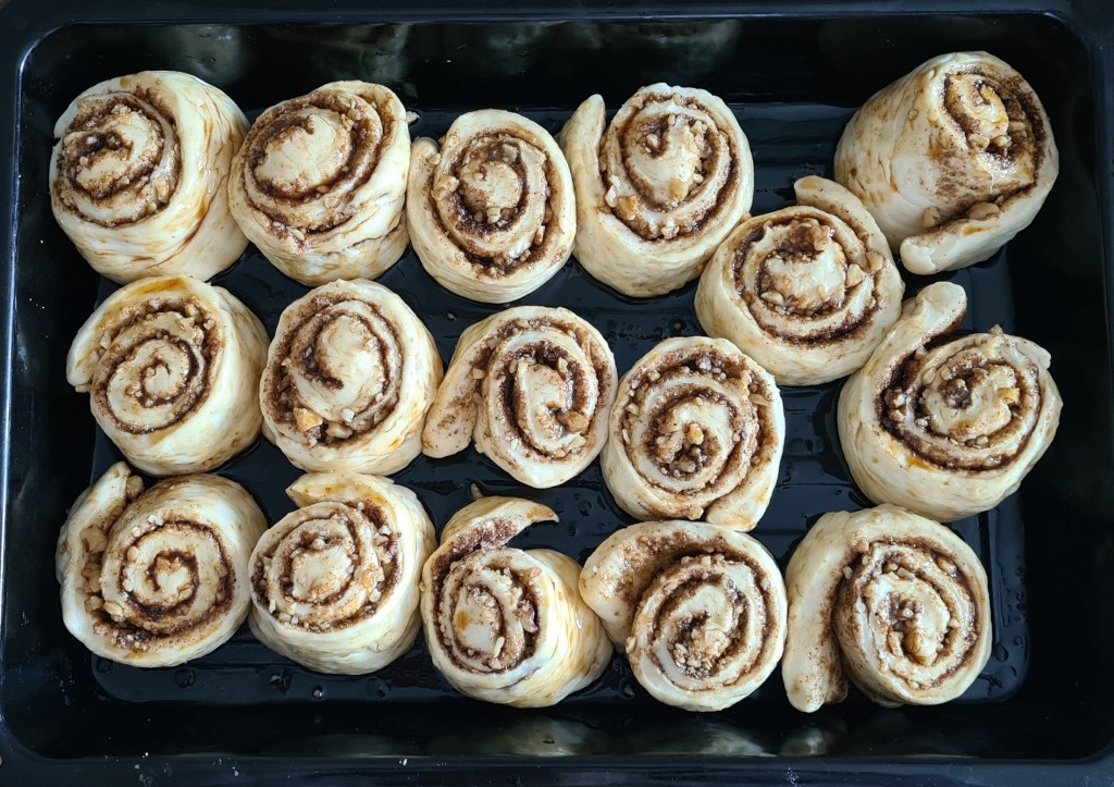- Daha sonra cevizi ve susamı serpin. Rulo şeklinde sarın, 2 parmak kalınlığında kesin. Yağladığınız tepsiye aralıklarla dizin