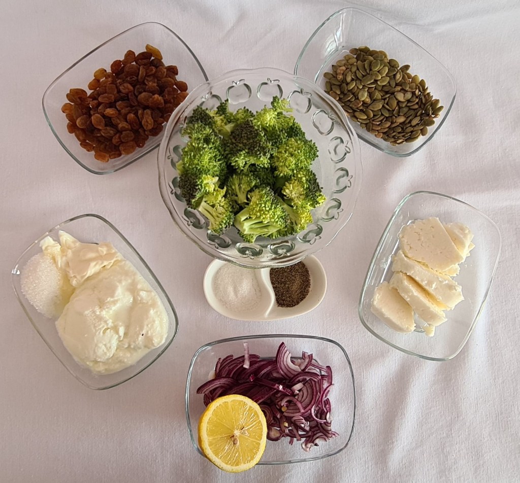 - Kuru üzümleri suda 30 dakika bekletin ve süzün. Brokoli, soğan, üzümleri, küp doğranmış beyaz peyniri ve çekirdek içini karıştırın