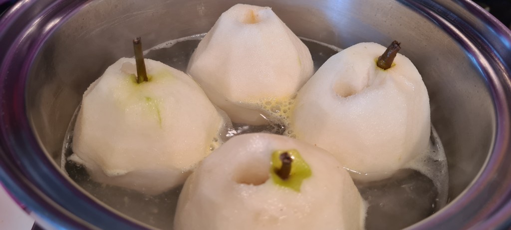 - Armutların kabuklarını soyun. Limonlu suda 10-15 dakika haşlayın. Armutların yumuşayıp yumuşamadığını kontrol edin. Yumuşamamışsa biraz daha haşlayın.