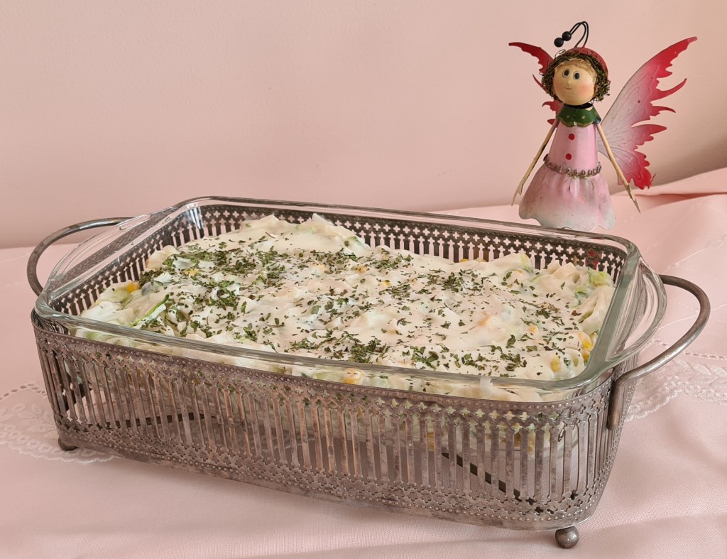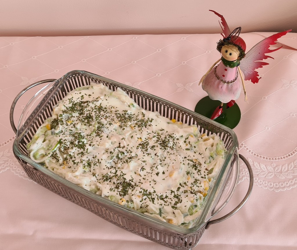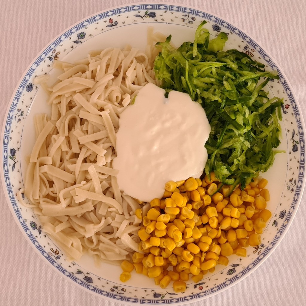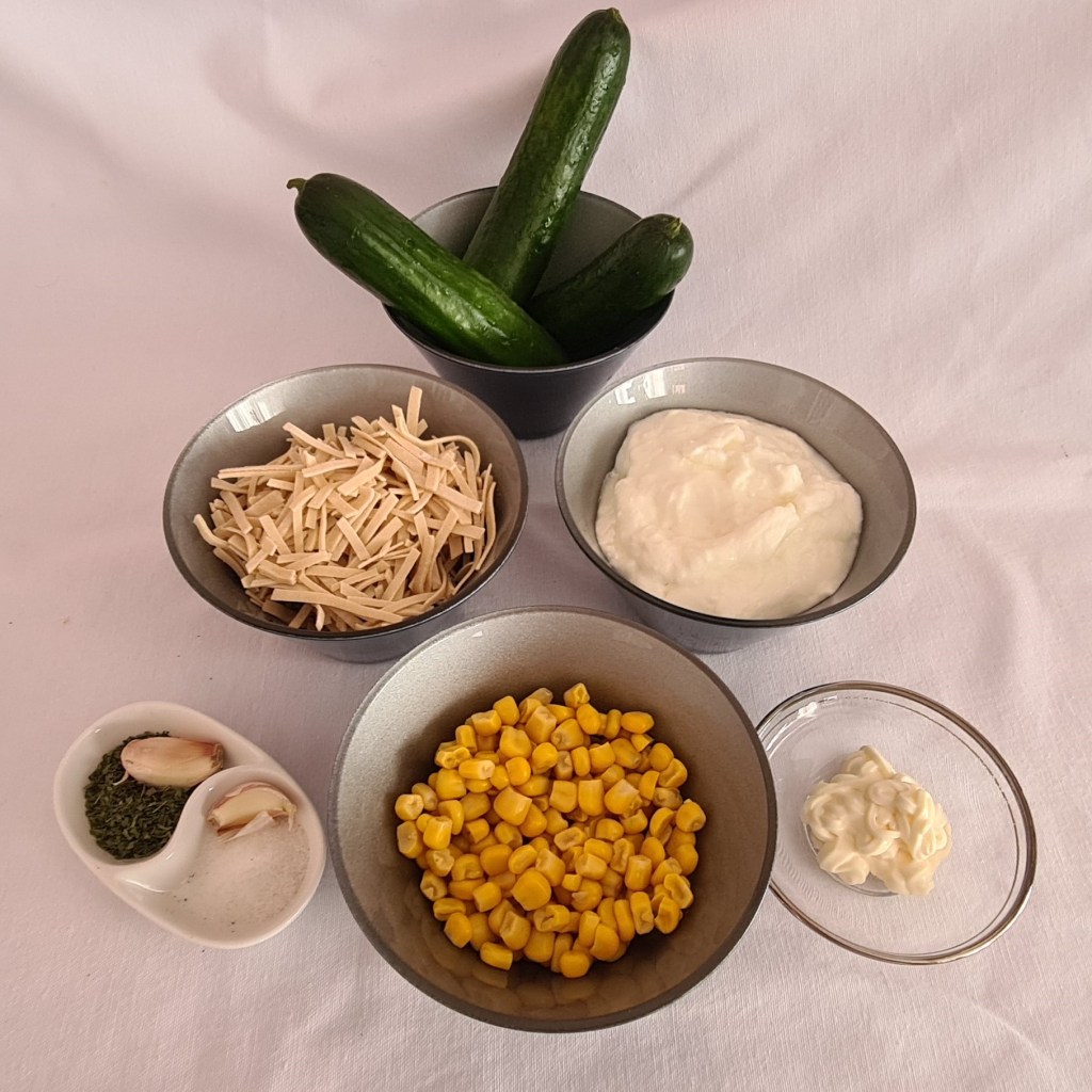 - Bir derin kapta erişte, salatalık ve mısırı karıştırın.