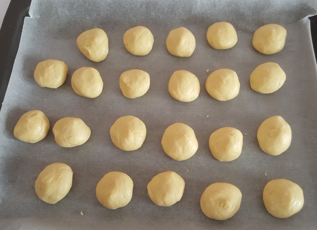 - Ceviz büyüklüğünde parçaları yuvarlayıp tepsiye dizin.